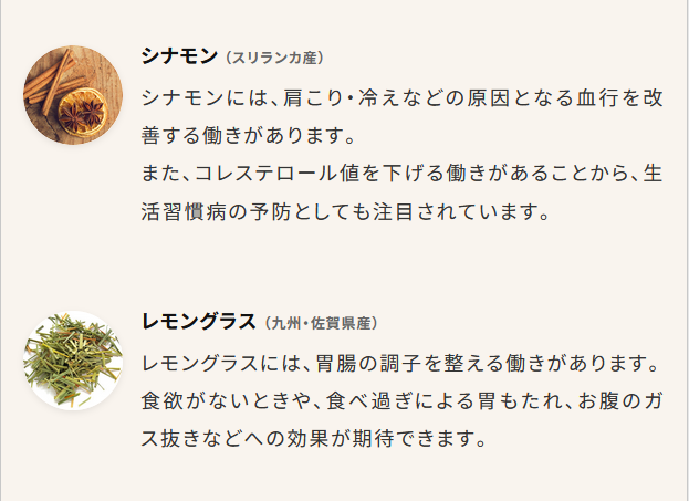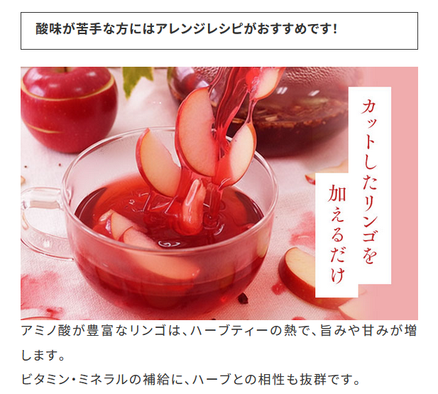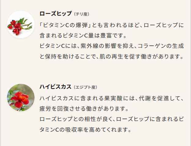 ・成分:ローズヒップ、ハイビスカス、ルイボス、エルダーフラワー、シナモン、レモングラス